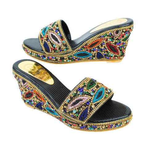Handcrafted Black Gold Multicolour Heel Wedge Sandals